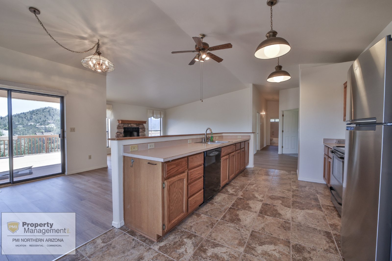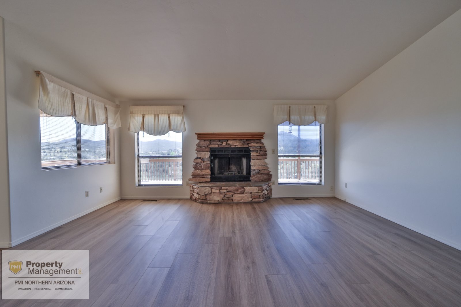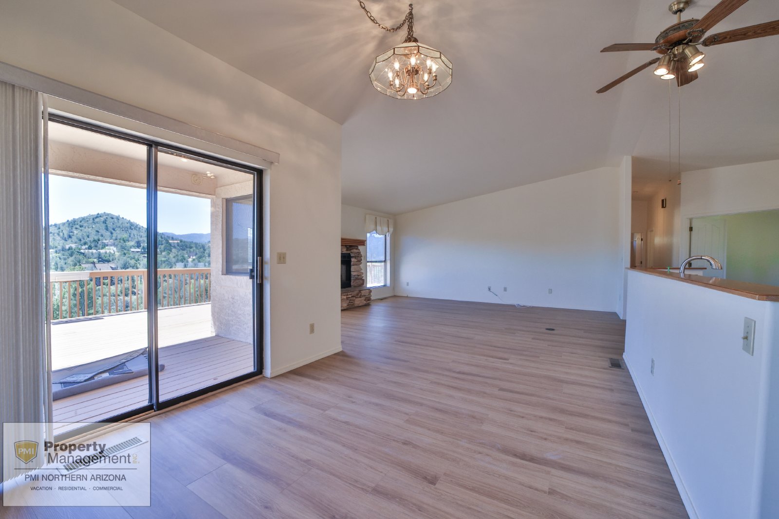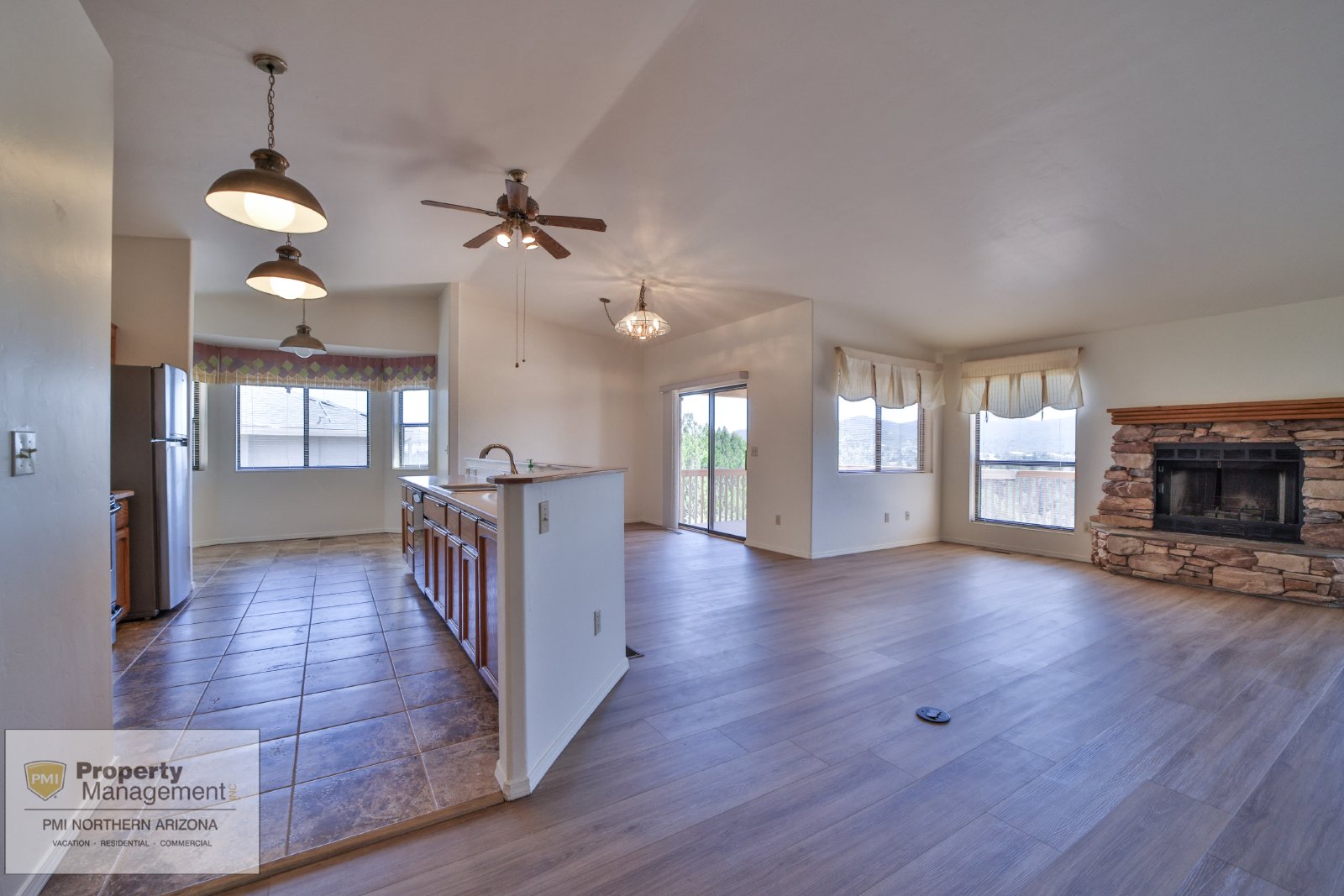 Spacious 3 bedroom, 2 bath, 1,914 sq ft home with 2 car garage in Yavapai Hills with views of Bradshaw Mountains. Open concept kitchen and living room with large windows and doors to partially covered back deck looking out to Bradshaw Mountain Range. Deck is gated at the stairs leading down to the small fence enclosed portion of the back yard. Kitchen features abundant cabinet and counter space. Island holds double basin kitchen sink and dishwasher. Refrigerator, stove and microwave are also included. Raised ceilings through out. Carpeted bedrooms, tiled kitchen, vinyl in laundry room and bathrooms. Freshly painted interior and new vinyl plank in living room and hallway. Window coverings of blinds and valances included. Fireplace in living room is not for tenant use. Master bedroom includes slider to back deck, walk-in closet and en suite bath with dual sinks, separate shower and tub (jets are not operational). Laundry room off of kitchen includes cabinet storage, counter top space, mud sink and gas or electric dryer hook ups. Garage access through laundry room.