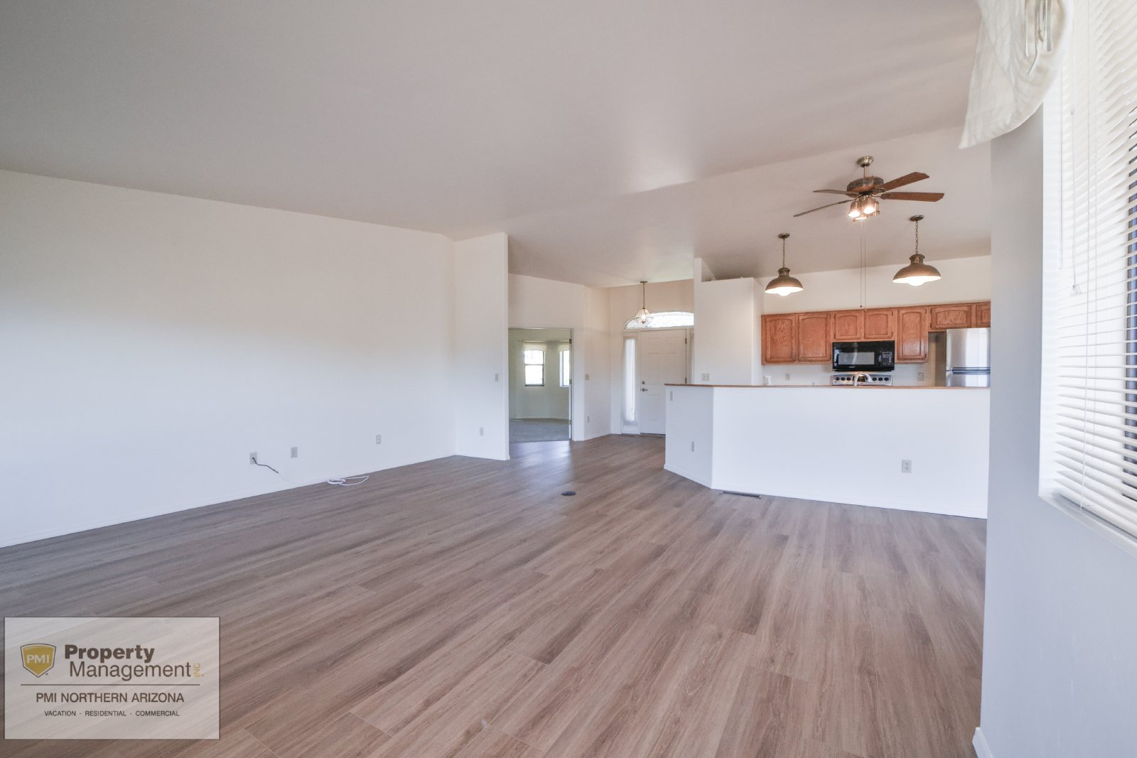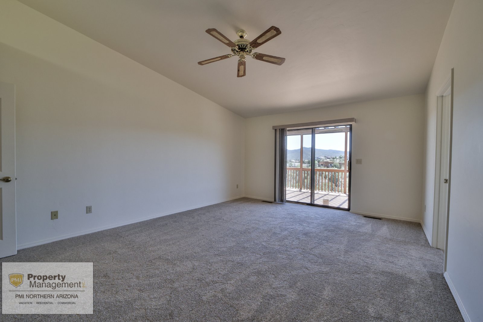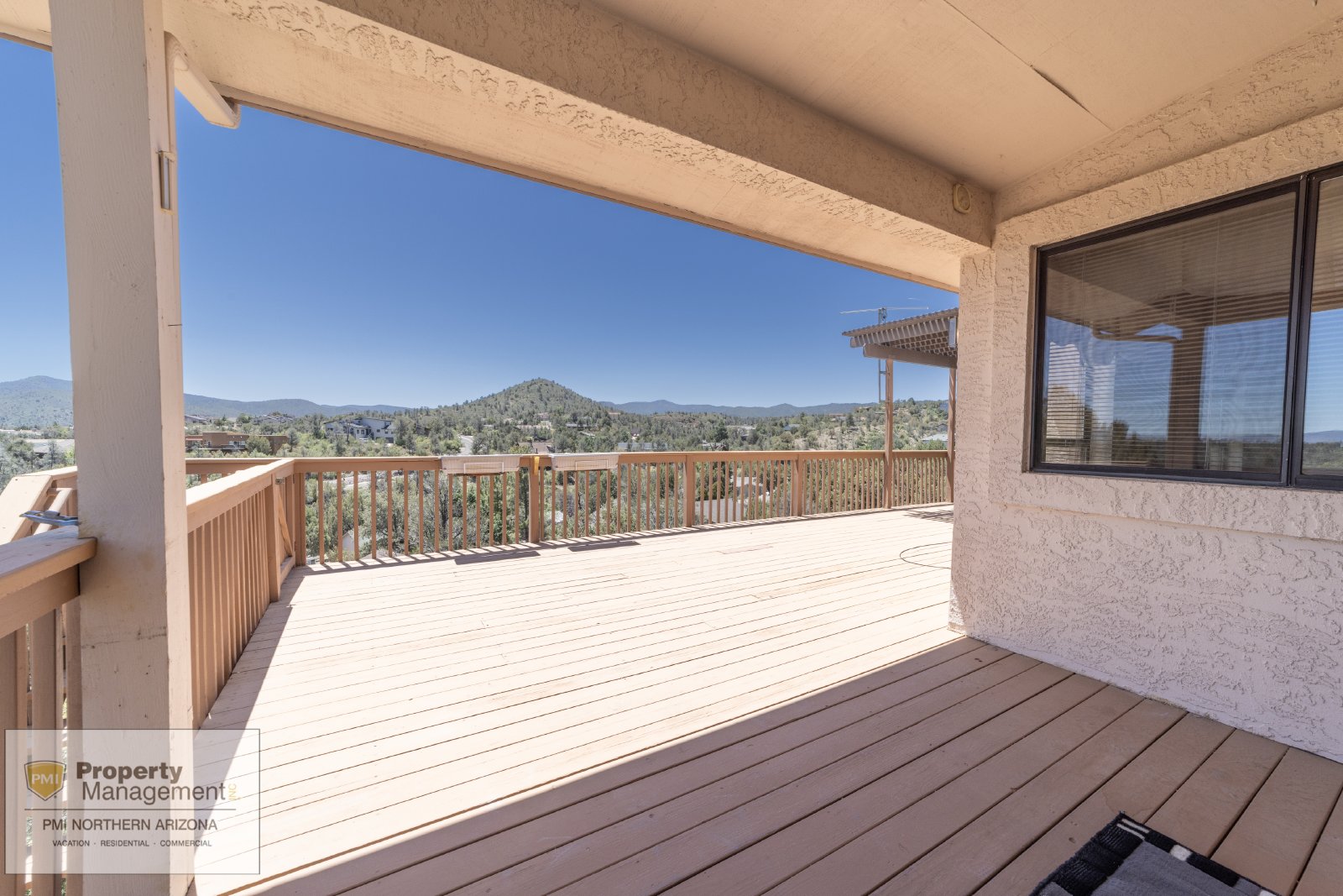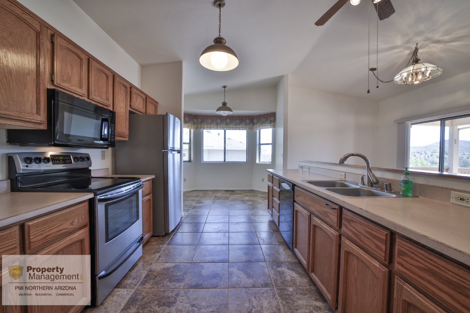 Spacious 3 bedroom, 2 bath, 1,914 sq ft home with 2 car garage in Yavapai Hills with views of Bradshaw Mountains. Open concept kitchen and living room with large windows and doors to partially covered back deck looking out to Bradshaw Mountain Range. Deck is gated at the stairs leading down to the small fence enclosed portion of the back yard. Kitchen features abundant cabinet and counter space. Island holds double basin kitchen sink and dishwasher. Refrigerator, stove and microwave are also included. Raised ceilings through out. Carpeted bedrooms, tiled kitchen, vinyl in laundry room and bathrooms. Freshly painted interior and new vinyl plank in living room and hallway. Window coverings of blinds and valances included. Fireplace in living room is not for tenant use. Master bedroom includes slider to back deck, walk-in closet and en suite bath with dual sinks, separate shower and tub (jets are not operational). Laundry room off of kitchen includes cabinet storage, counter top space, mud sink and gas or electric dryer hook ups. Garage access through laundry room.