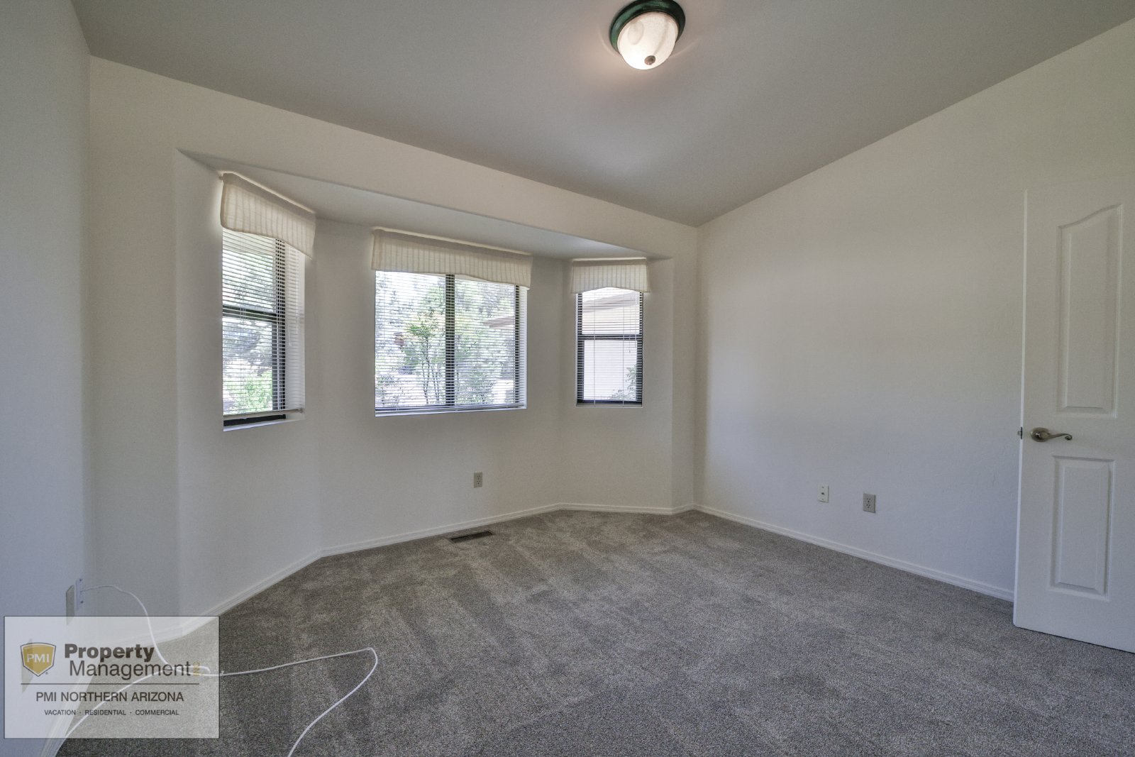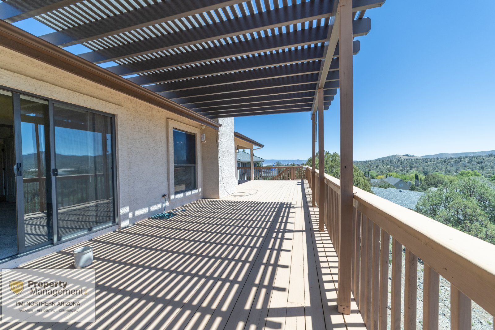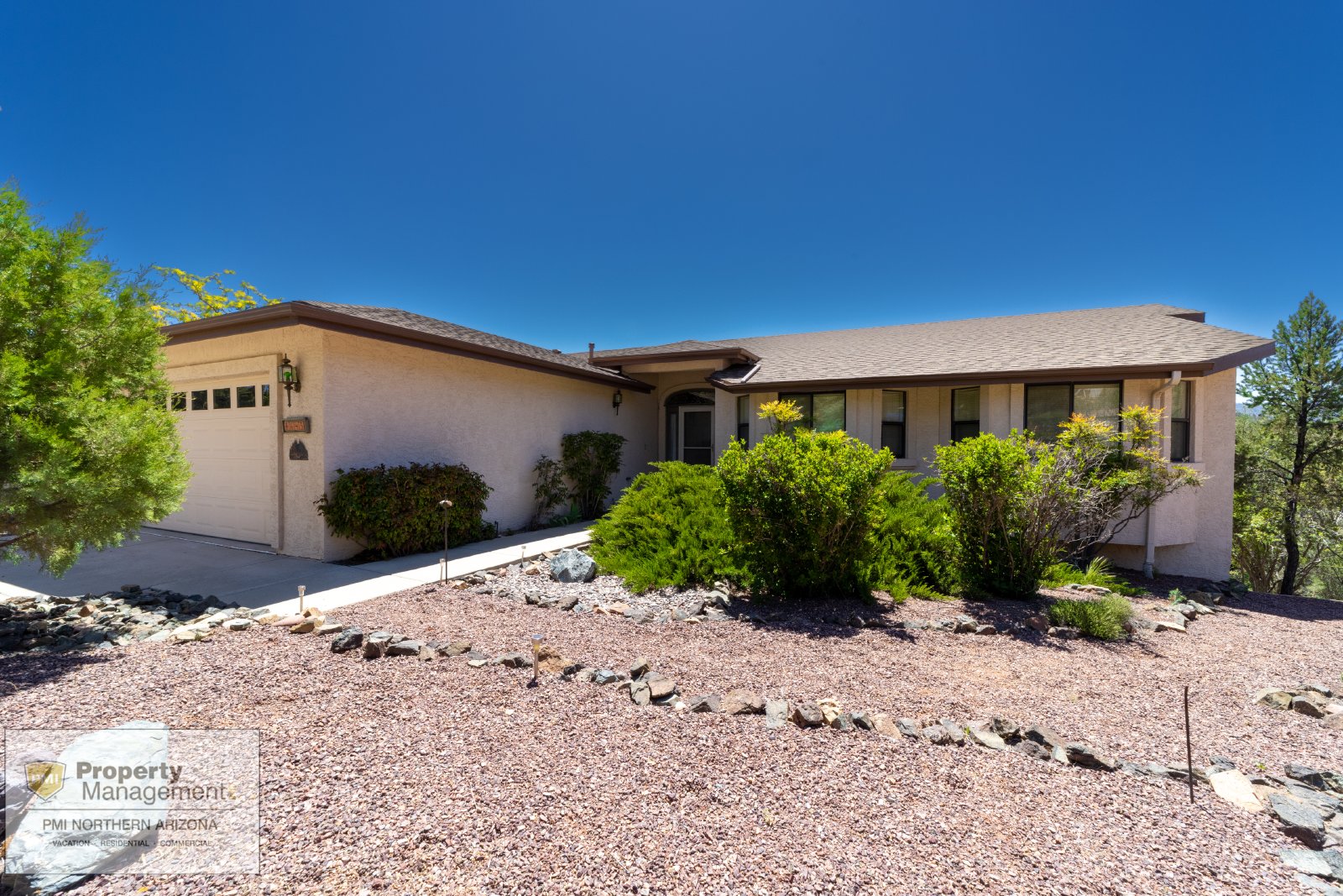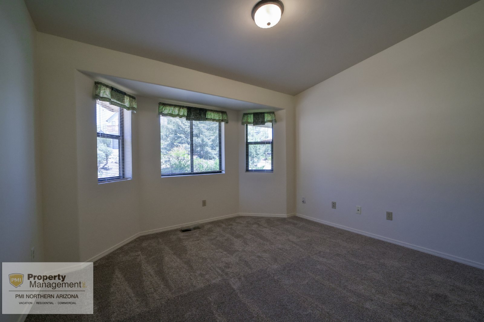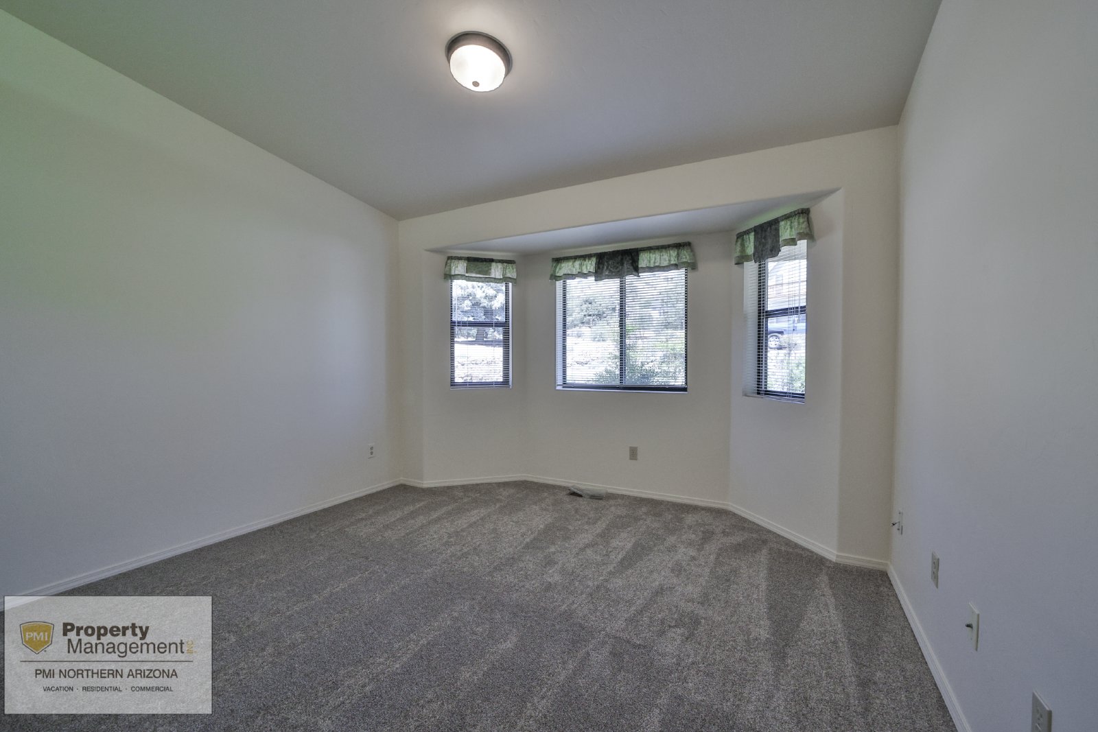 Spacious 3 bedroom, 2 bath, 1,914 sq ft home with 2 car garage in Yavapai Hills with views of Bradshaw Mountains. Open concept kitchen and living room with large windows and doors to partially covered back deck looking out to Bradshaw Mountain Range. Deck is gated at the stairs leading down to the small fence enclosed portion of the back yard. Kitchen features abundant cabinet and counter space. Island holds double basin kitchen sink and dishwasher. Refrigerator, stove and microwave are also included. Raised ceilings through out. Carpeted bedrooms, tiled kitchen, vinyl in laundry room and bathrooms. Freshly painted interior and new vinyl plank in living room and hallway. Window coverings of blinds and valances included. Fireplace in living room is not for tenant use. Master bedroom includes slider to back deck, walk-in closet and en suite bath with dual sinks, separate shower and tub (jets are not operational). Laundry room off of kitchen includes cabinet storage, counter top space, mud sink and gas or electric dryer hook ups. Garage access through laundry room.