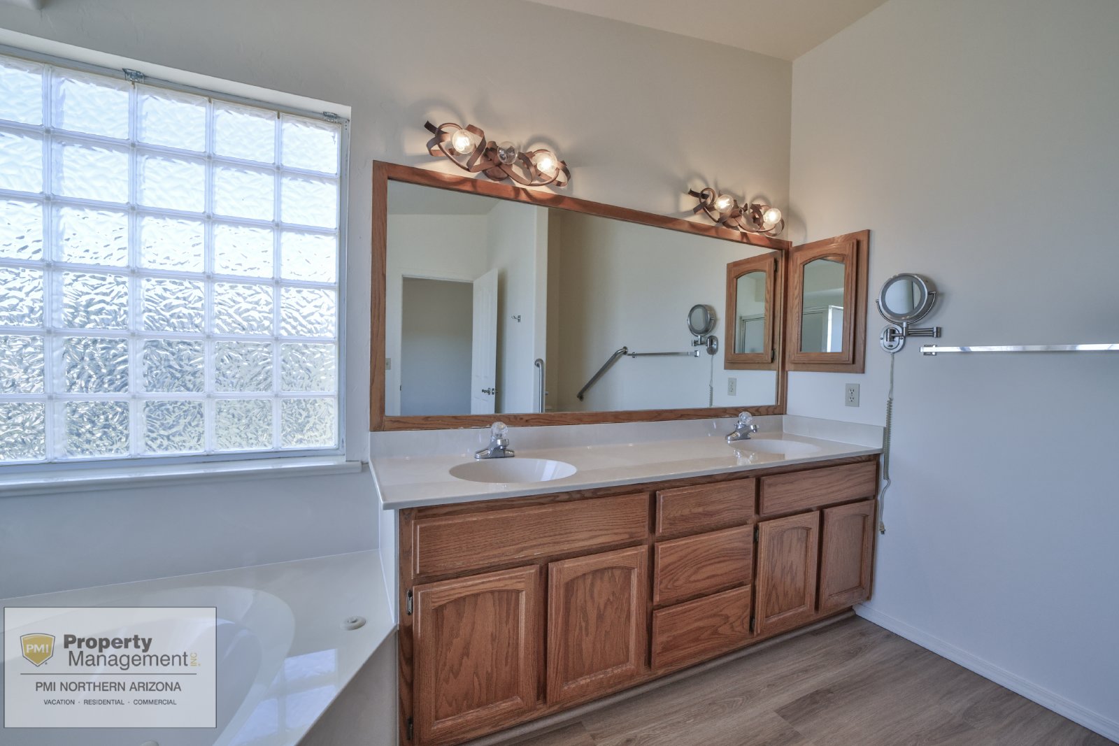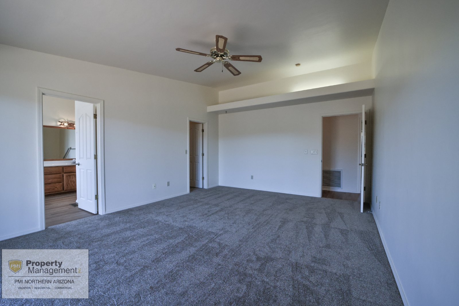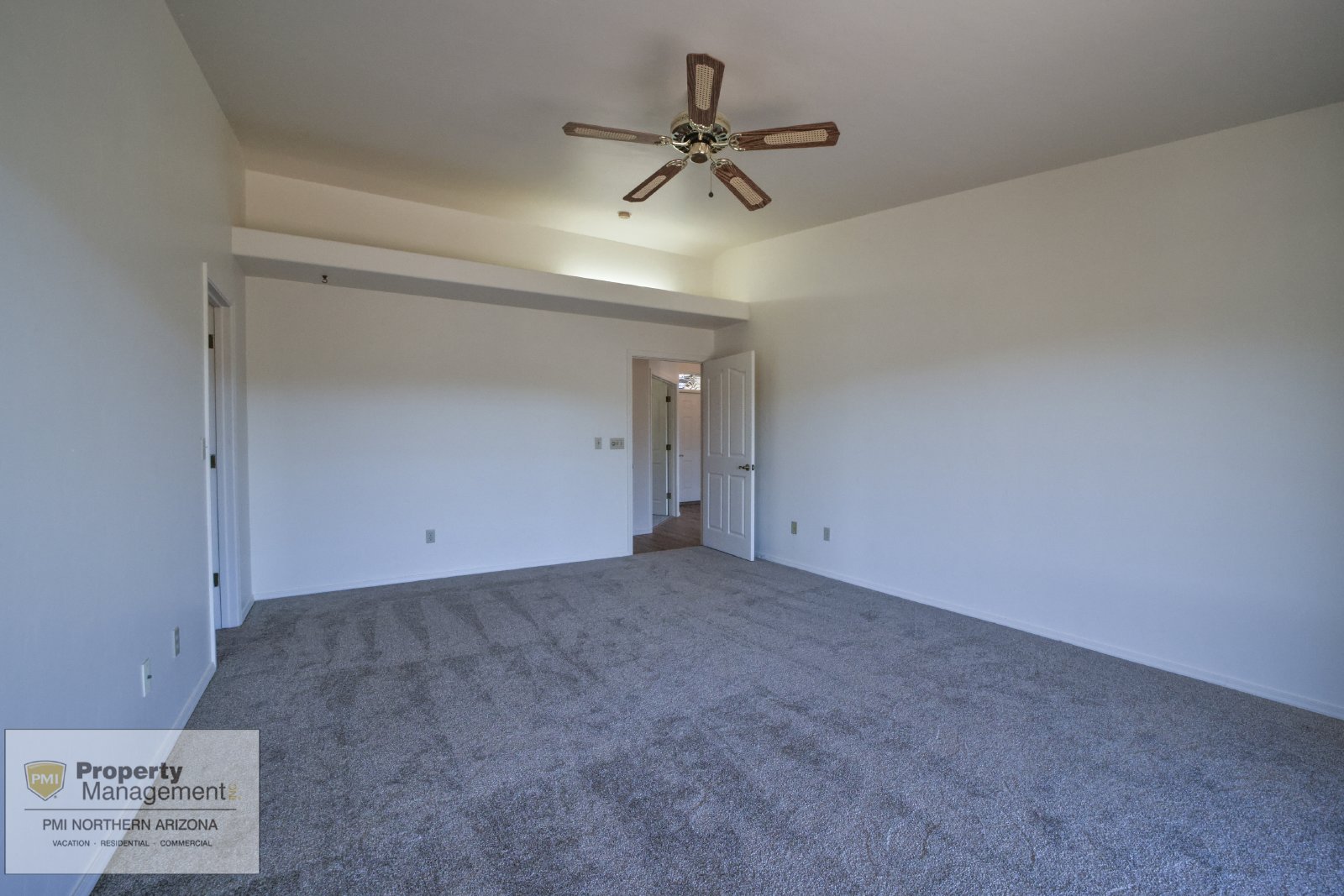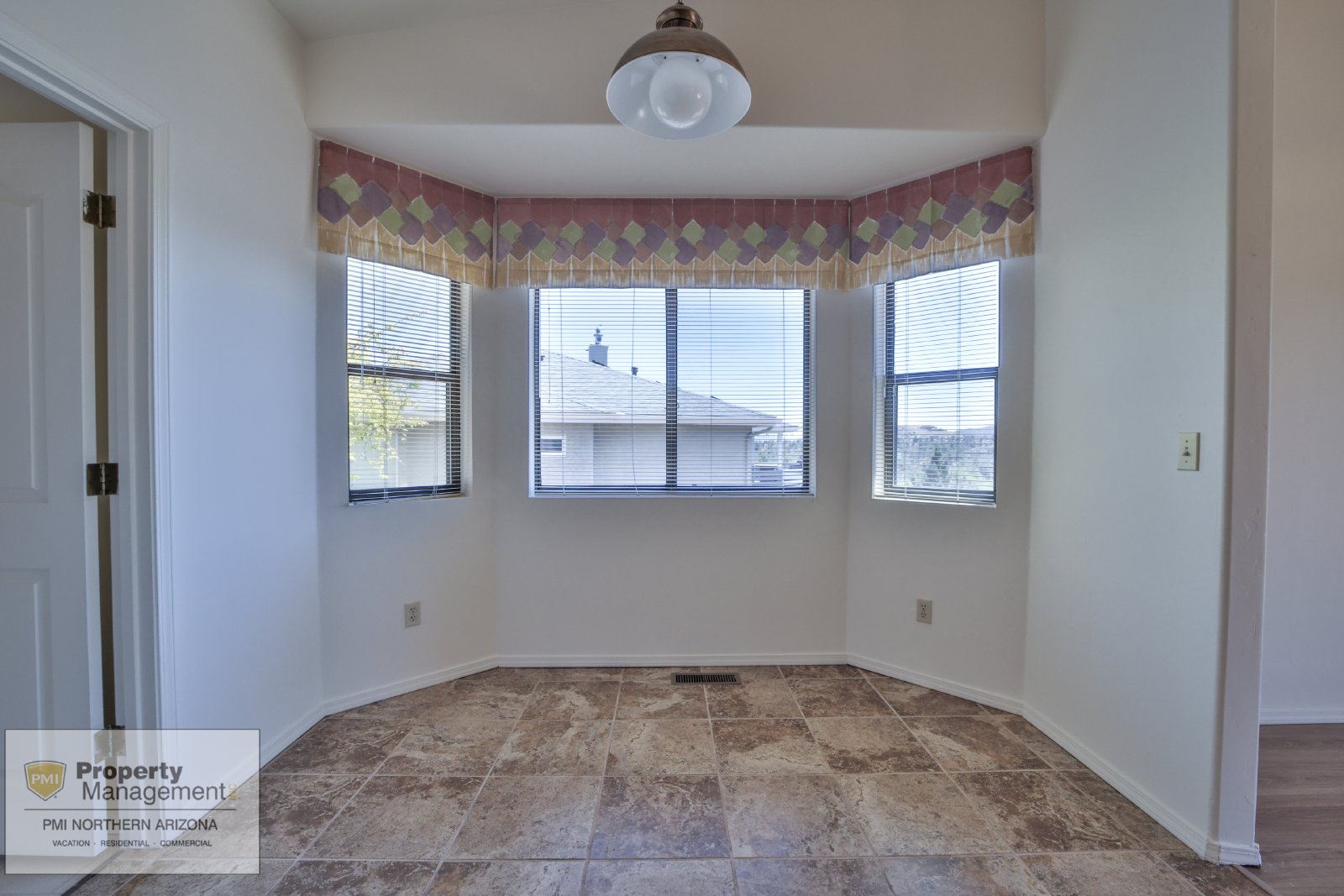 Spacious 3 bedroom, 2 bath, 1,914 sq ft home with 2 car garage in Yavapai Hills with views of Bradshaw Mountains. Open concept kitchen and living room with large windows and doors to partially covered back deck looking out to Bradshaw Mountain Range. Deck is gated at the stairs leading down to the small fence enclosed portion of the back yard. Kitchen features abundant cabinet and counter space. Island holds double basin kitchen sink and dishwasher. Refrigerator, stove and microwave are also included. Raised ceilings through out. Carpeted bedrooms, tiled kitchen, vinyl in laundry room and bathrooms. Freshly painted interior and new vinyl plank in living room and hallway. Window coverings of blinds and valances included. Fireplace in living room is not for tenant use. Master bedroom includes slider to back deck, walk-in closet and en suite bath with dual sinks, separate shower and tub (jets are not operational). Laundry room off of kitchen includes cabinet storage, counter top space, mud sink and gas or electric dryer hook ups. Garage access through laundry room.